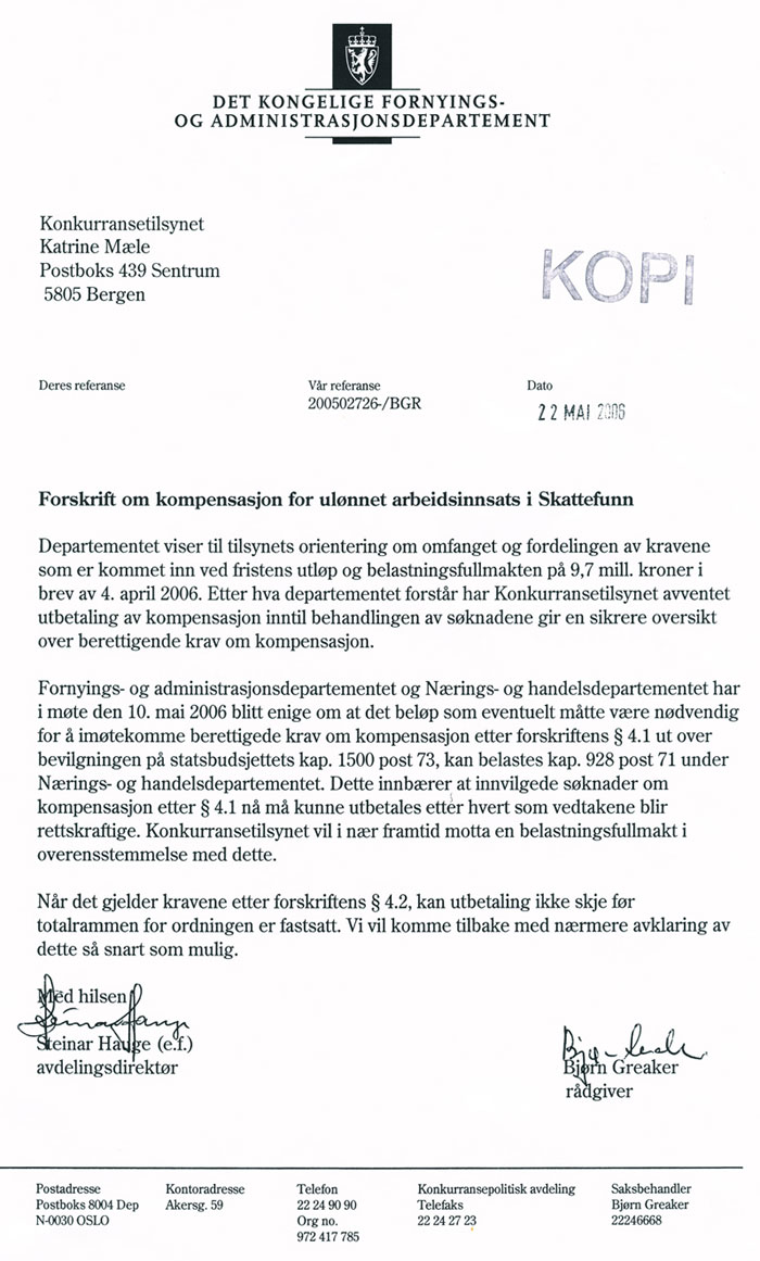 - Vi får endelig svar fra Næringsdepartementet som vedlegger et brev der de viser til at de den 30 juli, 2004 sendte saken til Finansdepartementet. Nå begynner visst runddansen.