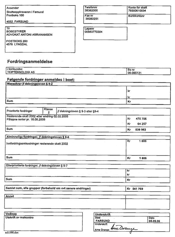 1. Den uforbeholdne ettergivelsen viser også at TeipTeknologi AS aldri skulle vært tvangsavviklet. Ettergivelsen viser klart at Brønnøysundregistrene tvangsavviklet selskapet på feil grunnlag – at det var statens egne feil som førte til tvangsavviklingen - slik jeg hele tiden grundig dokumenterte ovenfor Brønnøysund.