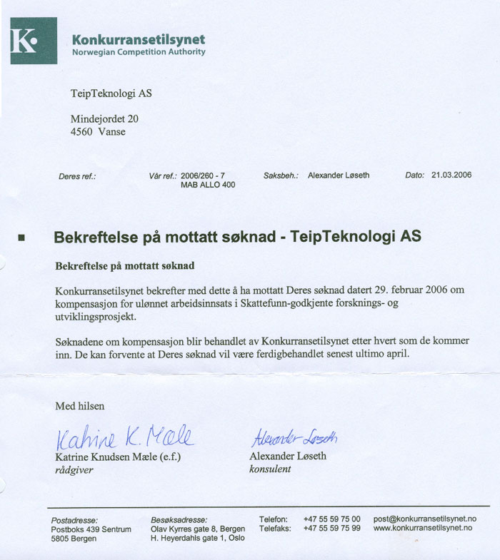 Jeg får en E-mail fra Norges forskningsråd der de skriver at de har registrert innsendt søknad om godkjenning av ovennevnte prosjekt i skattefradragsordningen ”SkatteFUNN”. Søknaden behandles ved SNDs distriktskontor i Vest-Agder. Eventuelle henvendelser angående søknaden kan rettes dit. - 000 A.