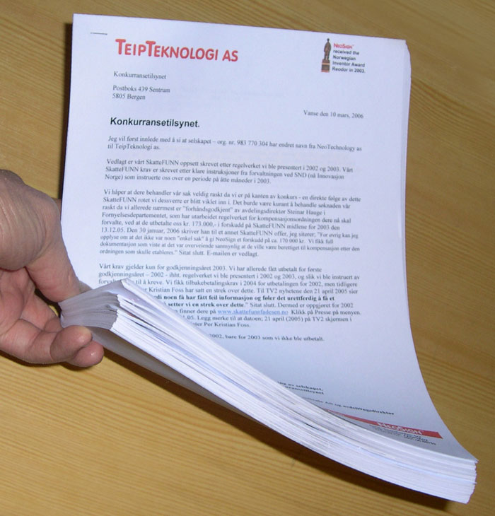 Selv om jeg gang etter gang har dokumentert så grundig at det hele tiden har vært hevet over enhver tvil (slik lagdommerne utrykte seg) at innsendingsplikten ikke ble overholdt som følge av forhold utenfor selskapets kontroll, (SkatteFUNN) holder forvaltningen fremdeles på å herje med ofrene for eget rot med krav og trusler om utleggsforretning. Dette er under enhver kritikk. Og til tross for at forvaltningen vet at de er klaget inn til Stortingets Kontroll- og Konstitusjonskomité for deres kritikkverdige handtering av saken. - 2073 august, 2009