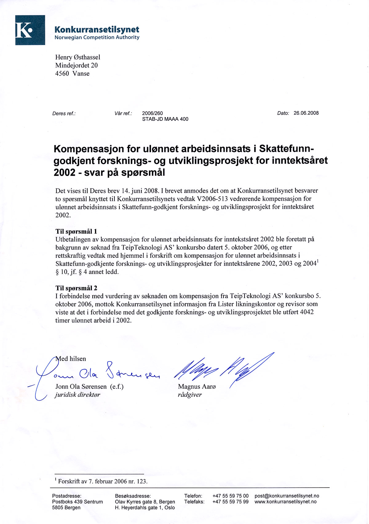 - Konkurransetilsynet svarer på Henry Østhassels brev i punkt 193. På mitt spørsmål om hvilke lovhjemmel de brukte for å utbetale for ulønnet egeninnsats på tross av vårt forbud vedlegger de bare et tvangsoppløsningsdokument fra tingretten Dette dokument gir dem ikke dem adgang til å bruke våre timer etter at vi har nedlagt forbud om det. Når jeg ber dem om å dokumentere hvor de får 3.292 ulønnede arbeidstime vedlegger de et dokument fra Lister Ligningskontor. Her ser det ut som Lister Ligningskontor har ført opp 313 timer for mye i ulønnet egeninnsats for Henry Østhassel. Alle kan gjøre feil, og dette ansees nå som oppklart og den delen av saken bilegges derfor.