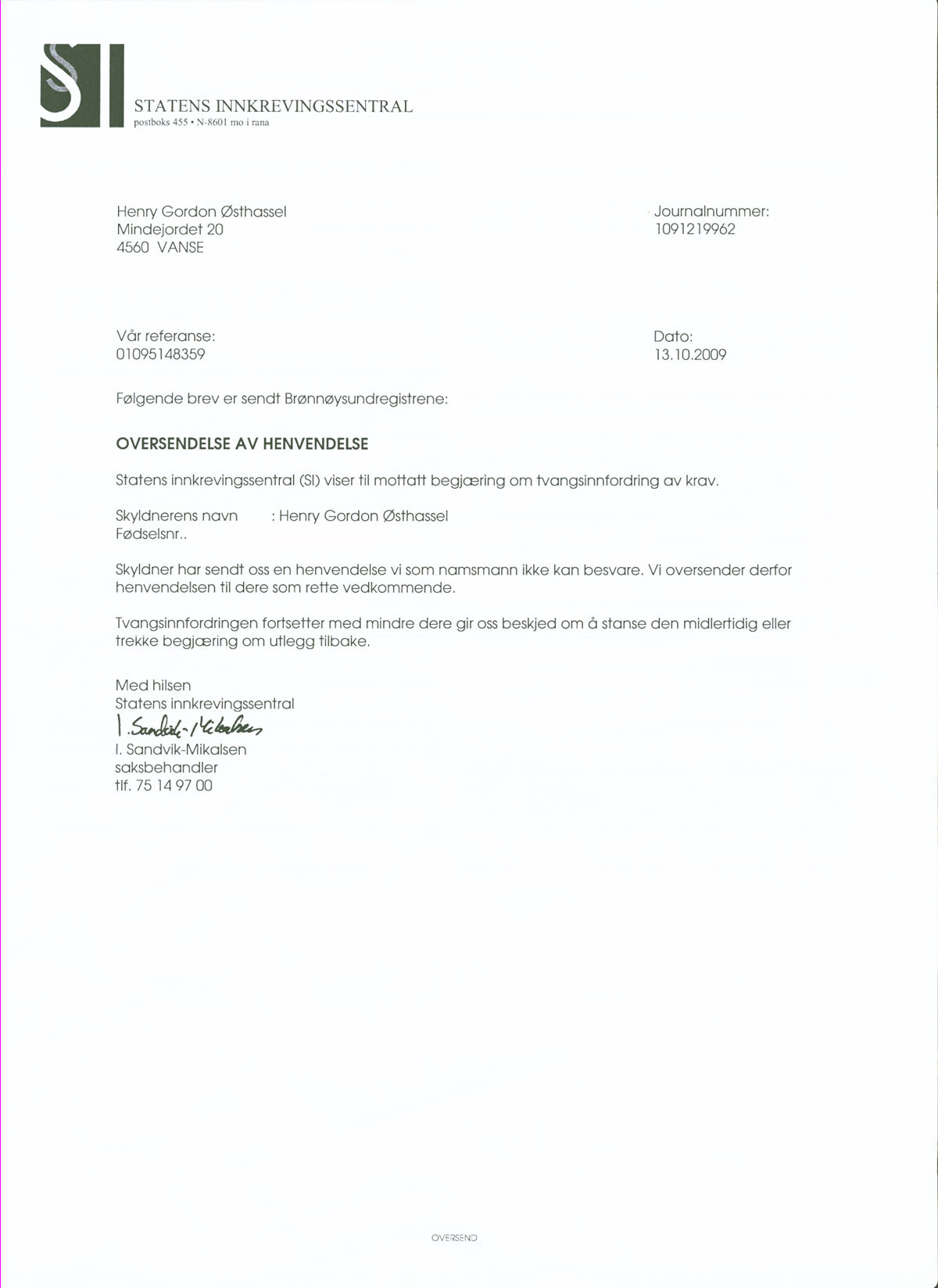 - Statens Innkrevningssentral sender brev til Brønnøysund registrene angående innkrevningen av forsinkelsesgebyret som er beskrevet i punkt 201, med beskjed om at tvangsfordringen fortsetter med mindre Brønnøysund stanser dette. Til tross for at Sivilombudsmannen har kritisert gebyrene og anmodet dem om å omgjøre vedtaket – til tross for at Borgarting Lagmannsrett har avgitt en krystallklar dom på at alle våre problemer skylder forvaltningen selv og at vi ikke var å klandre, fortsetter byråkratene å herse med ofrene for deres eget rot.