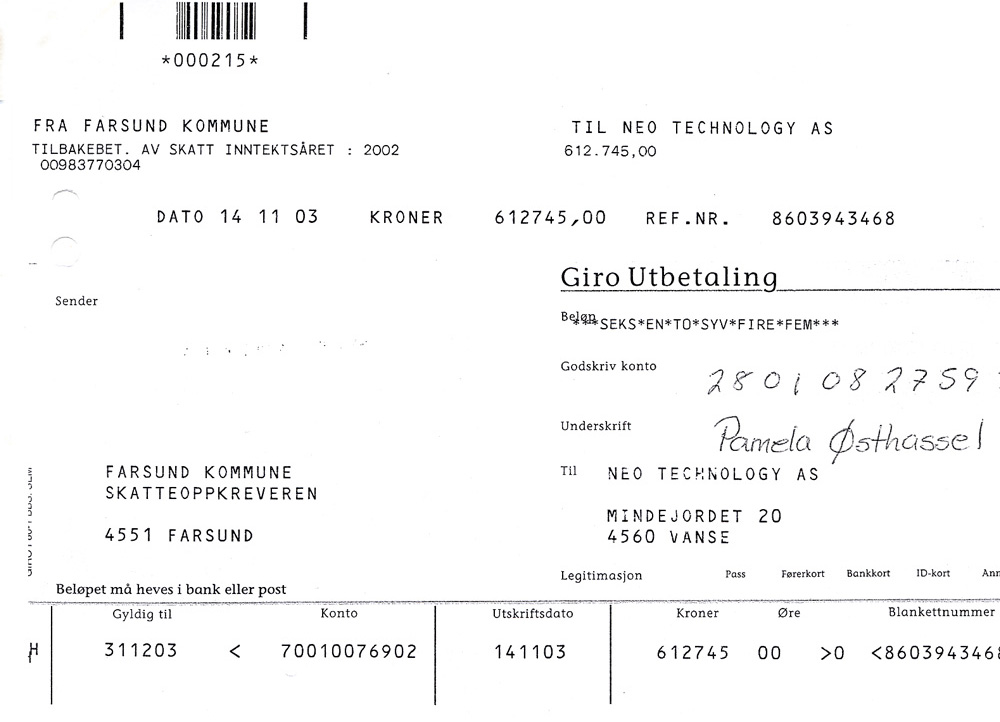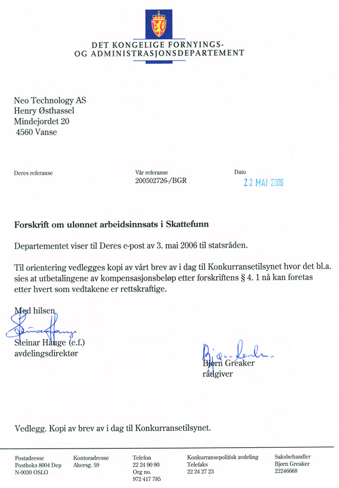 - En periode på nesten 8 hele måneder - lager NeoTechnology as et SkatteFUNN oppsett for 2002 (Excel fil) – hele veien veiledet av det offentlige hjelpeapparatet - utpekt av regjeringen – vi stilte alle de kontrollspørsmål det var mulig for oss å gjøre i hele 8 måneder – før vi til slutt sendte SkatteFUNN oppsettet inn til revisorgodkjennelse - i tråd med regelverket – som så godkjenner oppsettet. Dette førte til at vi nå var garantert SkatteFUNN utbetaling. I følge Norsk Forskningsråd og SND kan verken likningskontorene eller skattefuten overprøve vår SkatteFUNN godkjenning, noe skattefuten bekreftet. Samtidig hadde vi allerede ført ferdig store deler av SkatteFUNN oppsettet for 2003 (Excel fil) der vi fort regnet ut at vi ville få rundt kr. 700.000,- utbetalt høsten 2004. Dette fremla vi for våre investorer. Samtidig utarbeidet vi nye budsjetter - inkludert SkatteFUNN midlene for begge godkjenningsårene - og fremla også dette for våre investorer. På bakgrunn av dette investerte de kr. 2 mill. i selskapet i form at et ansvarlig lån - som skal konverteres i aksjer så fort det er ønskelig og nødvendig. Våre investorer ble derved lurt trillrundt.