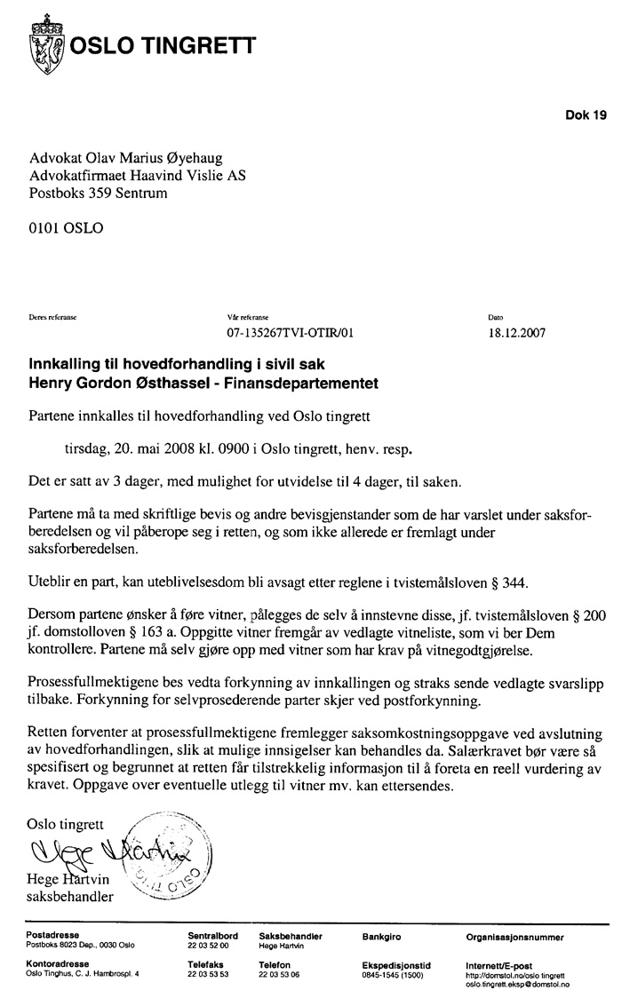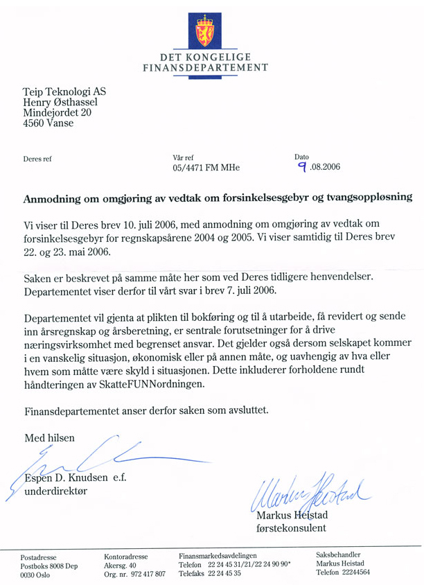 - Av alle ting sender Finansdepartementets byråkrater gebyrsaken tilbake til Kredittilsynet og ber om Kredittilsynets tilrådning – til tross for at Kredittilsynet den 16 april, 2009 (se punkt 195 og 198 B) ikke ville ta saken opp til ny vurdering før finansdepartementet har tatt stilling til forsinkelsesgebyret for 2003?!?!? Dette kan bare ansees som utspekulert ondskapsfull arroganse vel vitende om at ofrene for deres egen feilinformasjon fortsatt lider overlast (slik Borgarting Lagmannsrett så klart har fastslått i domspremissene). Advarselen i forrige punkt var siste sjansen Østhassel ga byråkratene Finansdepartementet til å rydde opp i gebyrsaken. Som forventet blåste de en lang marsj i advarselen. Navngitte direktører og ekspedisjonssjefer i Finansdepartementet blir nå innklaget til Stortingets Kontroll og Konstitusjonskomité.