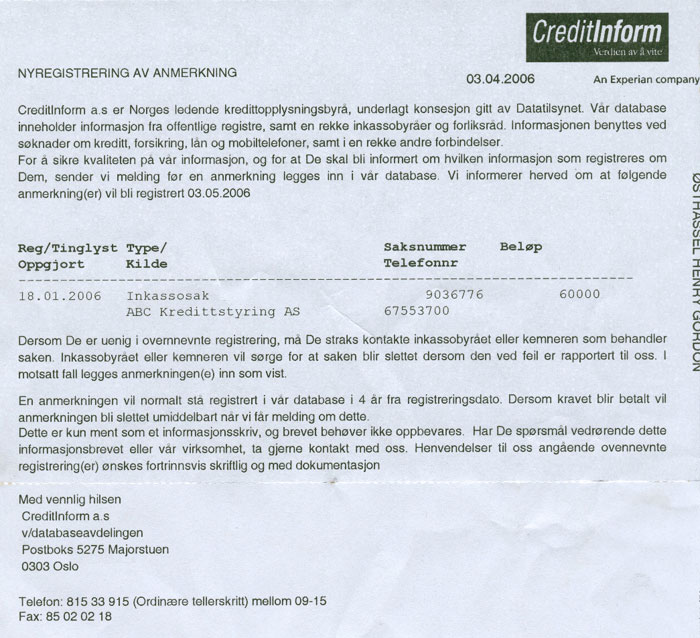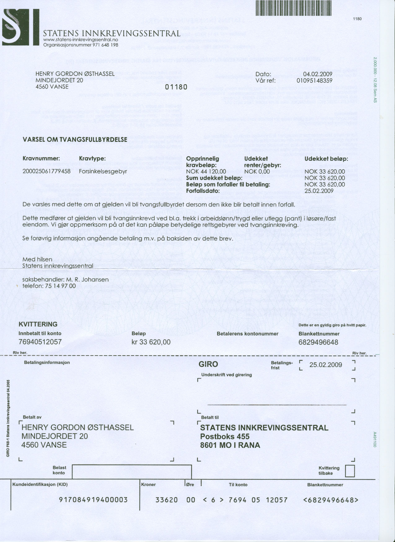 - Maktovergrepene fortsetter. Den 17 februar, 2009 - 14 dager før rettssaken begynner i Lagmannsretten får Henry Østhassel plutselig et krav fra Brønnøysundregistrene (som for øvrig var datert den 4 februar, 2009) gjennom statens Innkrevningssentral på kr. 33.620,- Det oppsiktsvekkende er at dette skjer 14 måneder etter at saken opprinnelig er avsluttet. Begrunnelsen er at Kredittilsynet gir et styremedlem fritak på sin ansvarsdel. Deretter sender forvaltningen Henry Østhassel - litt vel beleilig 14 dager før rettssaken i Lagmannsretten begynte – dette store kravet - og ødela dermed mye av Østhassels konsentrasjon i saksforberedelsene. Dette førte til mye ekstrabelastning for Østhassel og var en vesentlig årsak til at Østhassel ikke rakk å få frem et viktig vitne i saken som allerede var meldt retten som vitne den 4 mars, 2009.