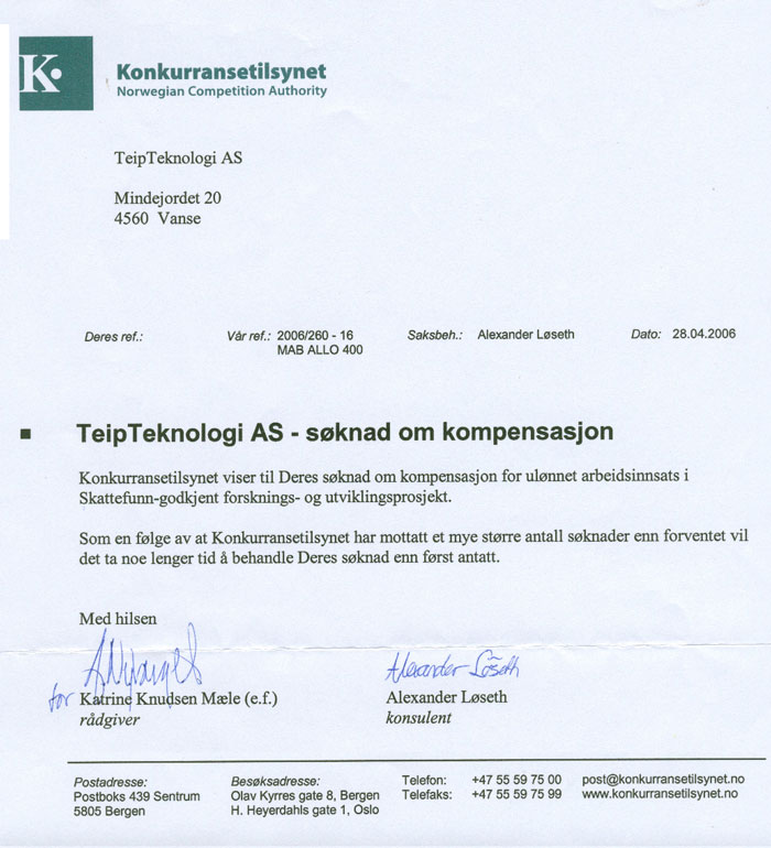 Jeg får en E-mail fra Norges forskningsråd der de skriver at de har registrert innsendt søknad om godkjenning av ovennevnte prosjekt i skattefradragsordningen ”SkatteFUNN”. Søknaden behandles ved SNDs distriktskontor i Vest-Agder. Eventuelle henvendelser angående søknaden kan rettes dit. - 000 A.
