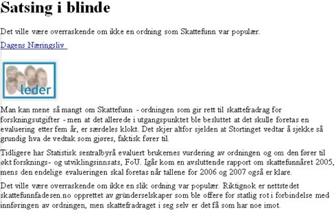 Skattefunnfadesen.no figurerer også i teksten. Dagens Næringsliv skriver:
